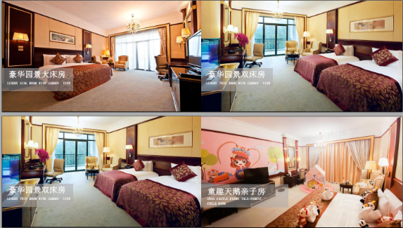 酒店主楼总建筑面积35096.09㎡,共十层(-1-9),提供310间60㎡以上大型客房,包括豪华大床房、双床房、家庭套房、湖景套房等9种房型。
